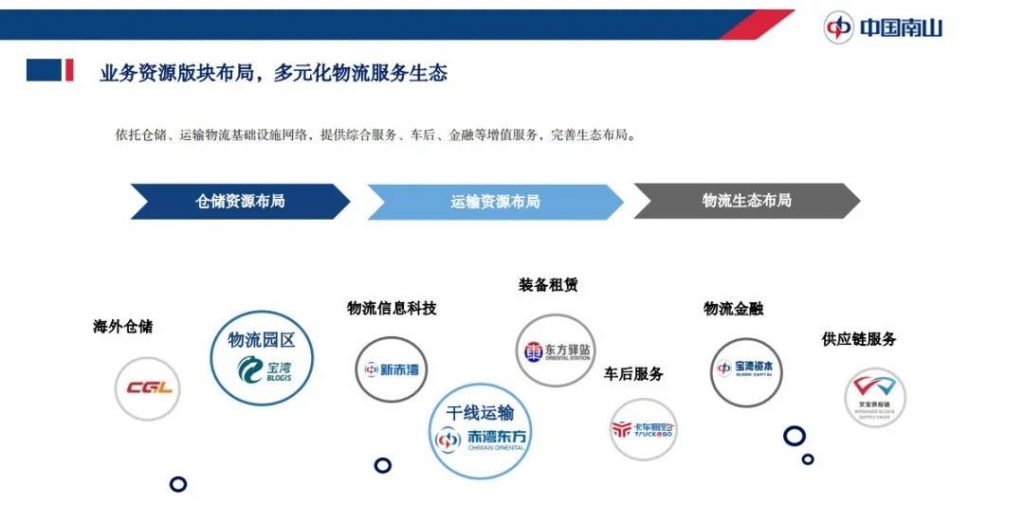 在此大背景下,中國(guó)南山集團(tuán)圍繞“1+2+3”大物流戰(zhàn)略展開(kāi)布局,構(gòu)建物流生態(tài)化發(fā)展。即一個(gè)戰(zhàn)略目標(biāo)(以“中國(guó)領(lǐng)先的物流產(chǎn)業(yè)生態(tài)服務(wù)平臺(tái)”為戰(zhàn)略目標(biāo)),兩輪驅(qū)動(dòng)(資源驅(qū)動(dòng)、科技驅(qū)動(dòng)),三大業(yè)務(wù)資源版塊(倉(cāng)儲(chǔ)資源版塊、運(yùn)輸資源版塊、物流生態(tài)版塊)。目前,中國(guó)南山集團(tuán)已形成覆蓋物流園區(qū)(寶灣物流+CGL)、物流科技 (新赤灣)、干線運(yùn)輸(赤灣東方)、裝備租賃(東方驛站)、供應(yīng)鏈(文寶供應(yīng)鏈)、車后(卡車易購(gòu))、金融(寶灣資本)等服務(wù)的生態(tài)布局。