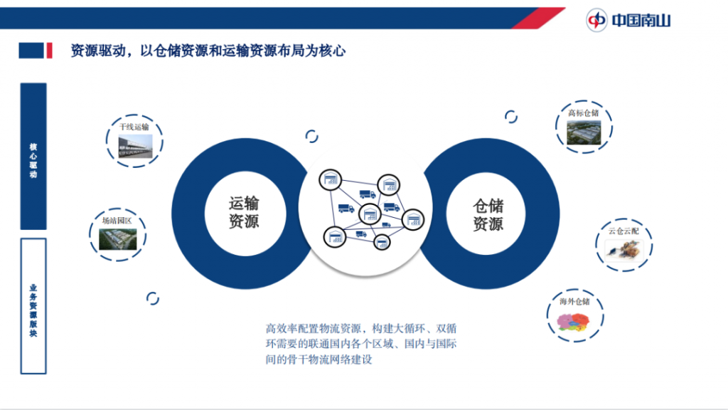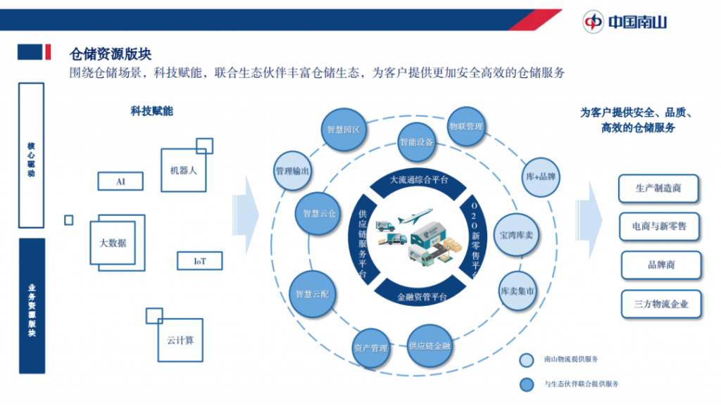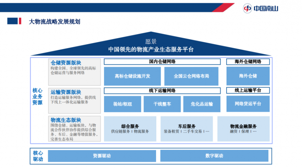 在核心的驅(qū)動(dòng)能力上,中國(guó)南山集團(tuán)已從過(guò)往的由資源驅(qū)動(dòng)(以倉(cāng)儲(chǔ)資源和運(yùn)輸資源布局為核心)進(jìn)化為兩輪驅(qū)動(dòng)(資源驅(qū)動(dòng)、科技驅(qū)動(dòng)),通過(guò)整合現(xiàn)有大物流板塊資源和科技能力,同物流生態(tài)合作伙伴一起,為客戶提供端到端的一體化供應(yīng)鏈物流服務(wù)。
