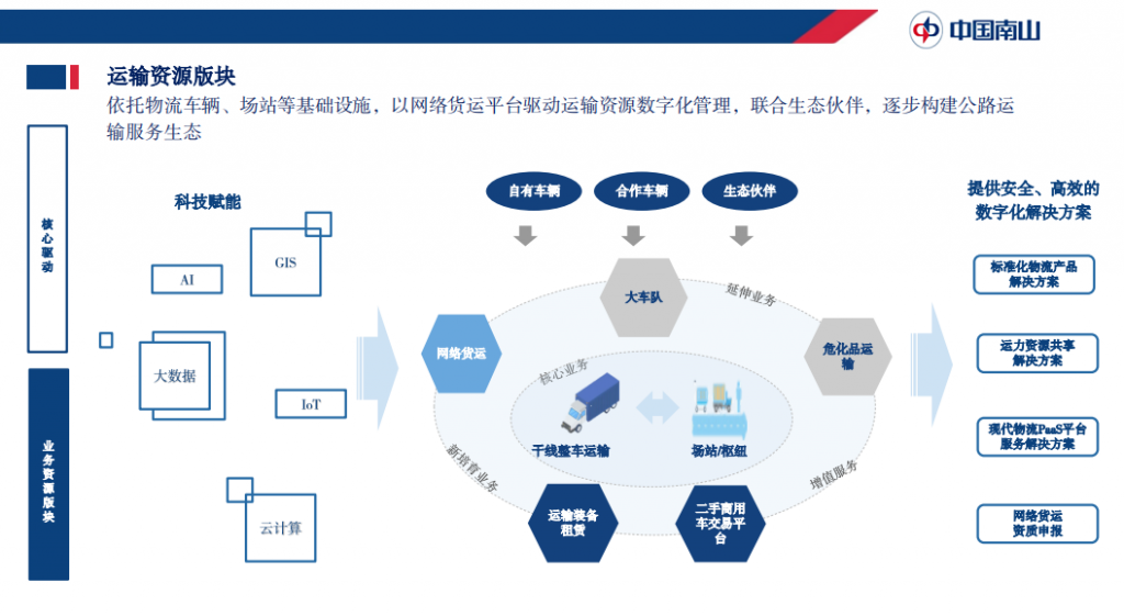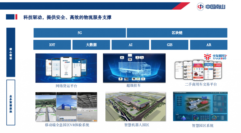 運(yùn)輸資源版塊現(xiàn)有包括網(wǎng)絡(luò)貨運(yùn)、干線整車運(yùn)輸、場(chǎng)站園區(qū)、危化品運(yùn)輸、二手商用車交易平臺(tái)、運(yùn)輸裝備租賃等業(yè)務(wù)板塊。目前擁有8,000余臺(tái)自有車輛,6萬(wàn)余臺(tái)長(zhǎng)期合作車輛,運(yùn)輸線路超過(guò)1,000條,是全國(guó)規(guī)模最大的自營(yíng)車隊(duì)。該板塊的核心企業(yè)“赤灣東方”更是被評(píng)為中國(guó)5A級(jí)物流企業(yè)和全國(guó)五星級(jí)大車隊(duì),是國(guó)家多式聯(lián)運(yùn)示范工程項(xiàng)目牽頭企業(yè),是中國(guó)最大的公路甩掛運(yùn)輸企業(yè)。 物流是技術(shù)應(yīng)用最佳場(chǎng)景,技術(shù)是物流行業(yè)進(jìn)步的重要驅(qū)動(dòng)。除在布局倉(cāng)庫(kù)、運(yùn)輸?shù)然A(chǔ)設(shè)施外,中國(guó)南山集團(tuán)通過(guò)科技驅(qū)動(dòng),大力發(fā)展包括網(wǎng)絡(luò)貨運(yùn)平臺(tái)、超級(jí)掛車、移動(dòng)端全息園區(qū)VR體驗(yàn)系統(tǒng)、智慧機(jī)器人園區(qū)等應(yīng)用為行業(yè)提供提供安全、高效的物流服務(wù)。