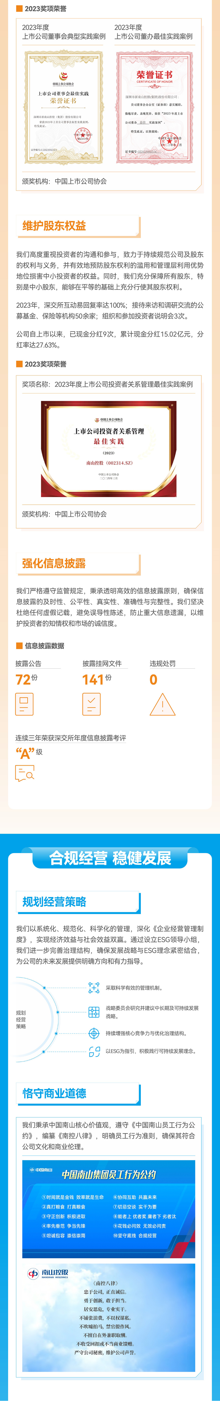 2023年是全面貫徹落實黨的二十大精神的開局之年,也是中國南山四十年跨越再出發(fā)的第一年。這一年,面對復雜嚴峻多變的外部環(huán)境,在中國南山戰(zhàn)略引領下,南山控股迎風破浪、逐夢前行,不斷提升管理水平,持續(xù)夯實發(fā)展根基,加快推進綠色轉型,培育壯大新質生產力,驅動公司在新征程上繪就高質量發(fā)展新的圖景。