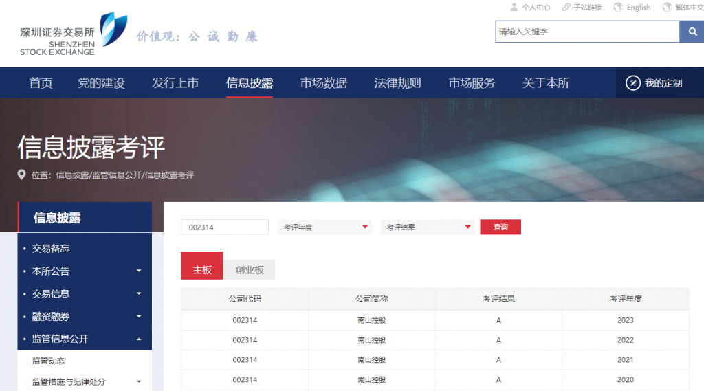 10月11日,深圳證券交易所(以下簡稱“深交所”)發(fā)布《主板上市公司2023-2024年度信息披露工作評(píng)價(jià)結(jié)果》,南山控股信息披露工作再獲最高評(píng)級(jí)“A”級(jí),這是公司連續(xù)第四年獲此榮譽(yù)。
