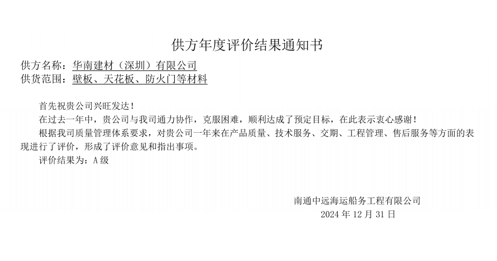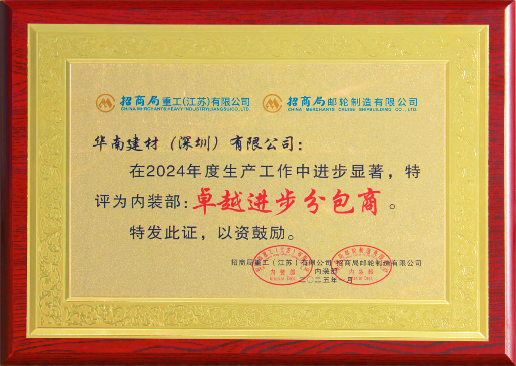 2025.01近日,公司旗下華南建材喜獲招商局重工(江蘇)有限公司與招商局郵輪制造有限公司共同頒發(fā)的“卓越進(jìn)步分包商”、招商局金陵船舶(威海)有限公司“風(fēng)雨同舟獎”、?江南造船(集團(tuán))有限責(zé)任公司“三星合作單位”、南通中遠(yuǎn)海運(yùn)船務(wù)工程有限公司年度評價A級等四個榮譽(yù),為2024年度完美收官增添了一抹靚麗色彩,為2025年的高質(zhì)量發(fā)展積蓄力量。