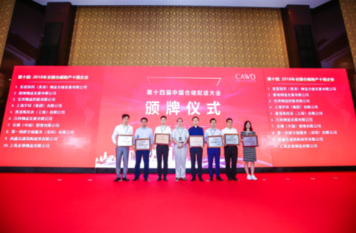 此次大會由中國倉儲與配送協(xié)會主辦, 會議公布了“2018年全國倉儲地產(chǎn)十強企業(yè)”,評選標準為2018年各企業(yè)在全國的倉儲面積。會上,中國倉儲與配送協(xié)會副會長郁士祥為十強企業(yè)頒發(fā)獎牌與證書,寶灣物流商務總監(jiān)孔鵬代表寶灣物流上臺領獎。