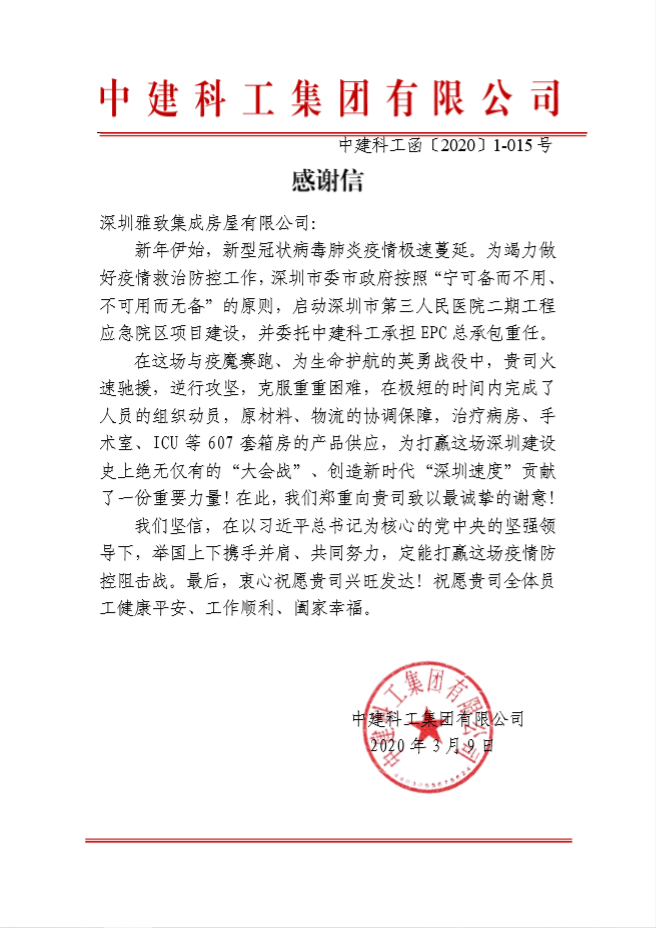 1月25日到3月中旬的50天時間,是武漢封城的50天,也是全國阻擊疫情的關鍵階段。雅致公司克服缺人、封城、防護物資不足等重重困難,充分發(fā)揚集團不怕犧牲、勇于奉獻、敢于爭先的作風,在疫情來臨時,在武漢、北京、深圳、三亞、南通、常熟等城市,多地同時協(xié)同作戰(zhàn),阻擊疫情,投入大量人力物力,累計生產、運輸、安裝箱房數千套,為取得全國性的抗擊疫情的勝利貢獻了自己的力量,獲得了客戶紛紛點贊。