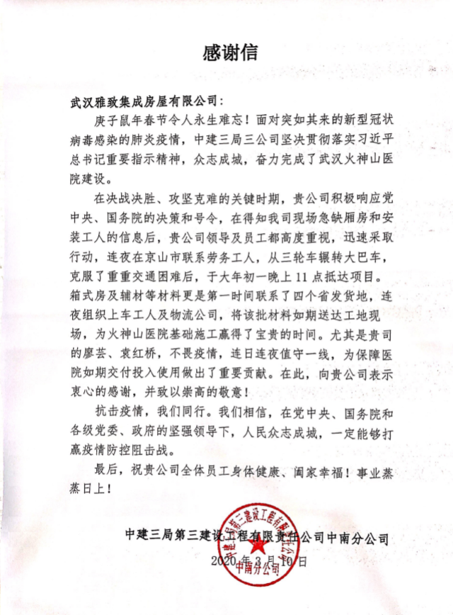 來自中建三局中南公司的感謝信