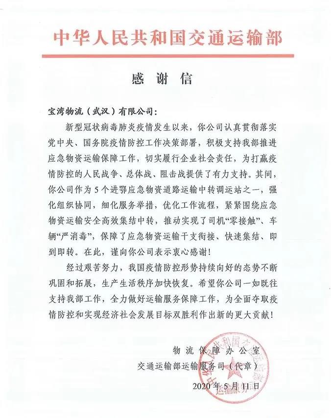 2020.055月11日,交通運(yùn)輸部為公司旗下寶灣物流武漢園區(qū)頒發(fā)感謝信,以感謝武漢園區(qū)在疫情期間,作為“進(jìn)鄂應(yīng)急物資道路運(yùn)輸中轉(zhuǎn)調(diào)運(yùn)站”為抗疫工作做出的突出貢獻(xiàn)。