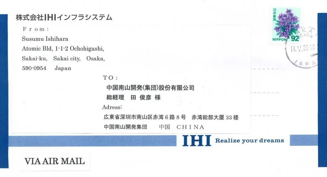 2020.06?6月8日,中國南山集團總經(jīng)理、南山控股董事長田俊彥收到一封來自日本IHI集團下屬企業(yè)IIS株式會社石原進社長的感謝信,信中對公司控股股東中國南山集團及其下屬的上海松尾公司為該株式會社捐贈口罩的善舉給予高度肯定。