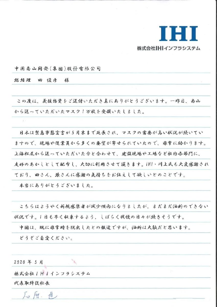 疫情之下,全球各國人民感同身受, IHI集團是中國南山集團的重要合作伙伴(2009年中國南山集團與 IHI集團共同出資成立合資企業(yè)——上海松尾),為了給合作伙伴抗疫渡困出一份力,中國南山集團以及上海松尾想方設法捐贈了一批口罩,第一時間完成報關將物資寄出。中國南山人的雪中送炭,讓IIS株式會社及IHI集團領導深受感動。5月14日,石原進向中國南山集團總經(jīng)理田俊彥發(fā)出了上述感謝信。信中寫道: