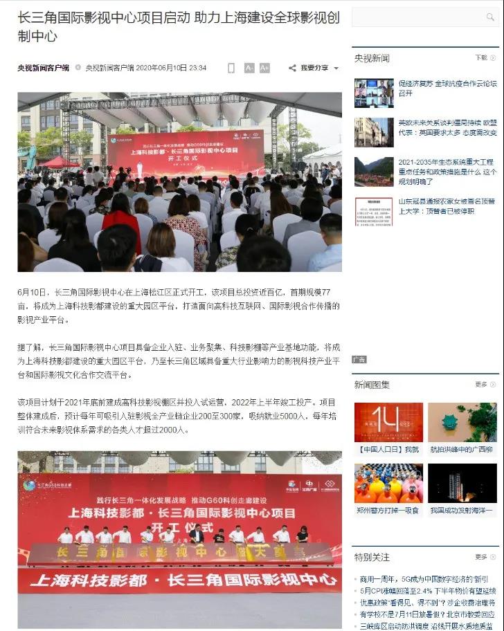 央視網(wǎng):長三角國際影視中心項目啟動 助力上海建設(shè)全球影視創(chuàng)制中心